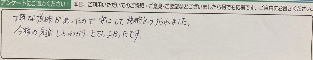 丁寧な説明があったので安心して施術をうけられました。今後の見通しもわかり、とてもよかったです。