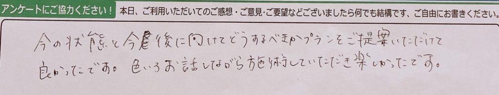 今の状態と今後に向けてどうすべきかプランをご提案いただけて良かったです。色々お話ししながら施術をしていただき楽しかったです。