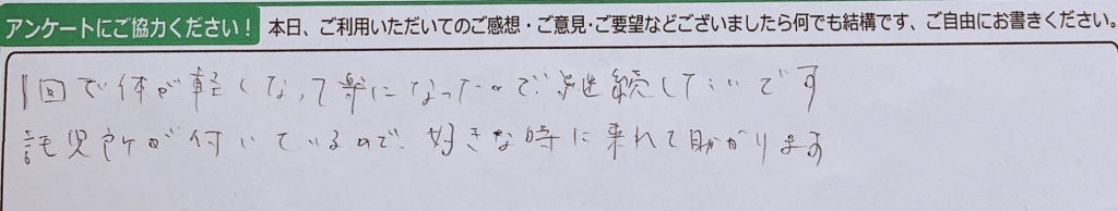 投稿日: 2026年1月11日 投稿者: wako.kairo.nishi.syokai産後骨盤矯正/肩こり【豊島区駒込 S.Dさん 33歳 女性 会社員】 1回で体が軽くなって楽になったので継続したいです。託児所が付いているので、好きな時に来れて助かります。 症状と歪みの専門院ワコー西日暮里整体院 ~産後骨盤矯正/腰痛、おまかせください~